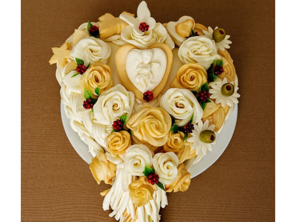 Dort je zdoben ručně modelovanými sýrovými růžemi, mašlemi a jinými ozdobami. Dozdobuje se decentně olivami,