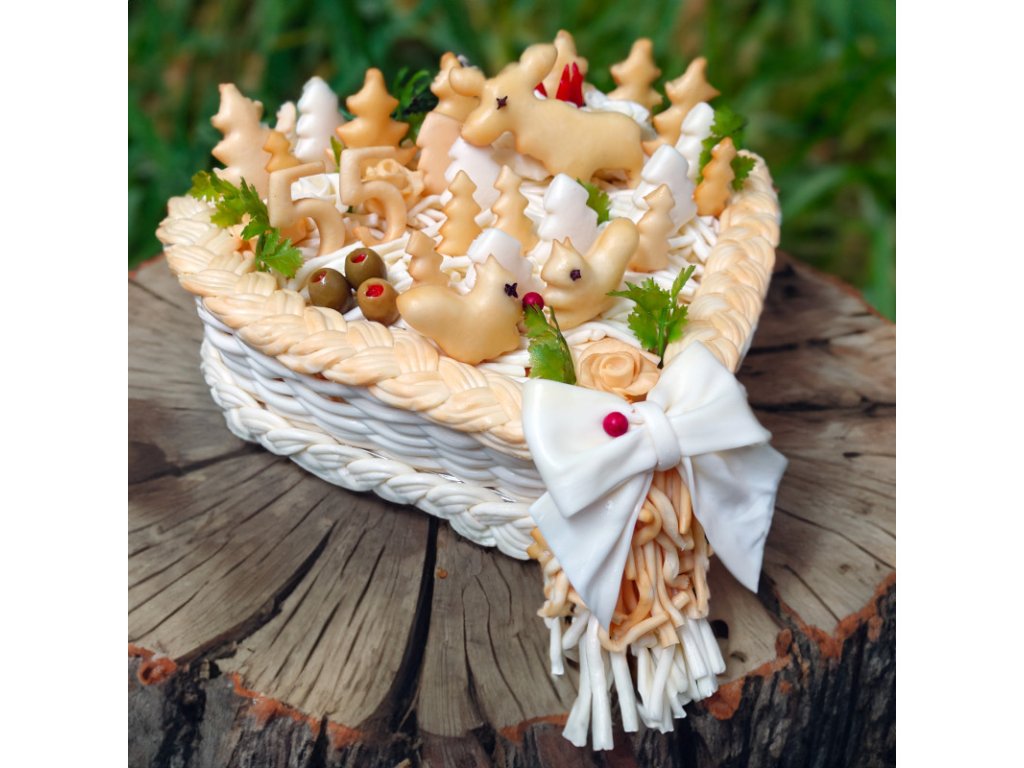 Dort je zdoben ručně modelovanými sýrovými růžemi, mašlemi a jinými ozdobami. Dozdobuje se decentně olivami,